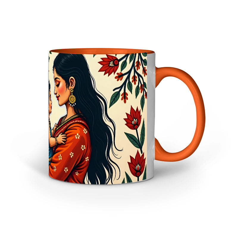 Drawing from the symmetrical layout and storytelling style of Madhubani paintings, this piece subtly infuses traditional forms like foliage arcs and eye-to-eye character symmetry to evoke a timeless Indian maternal narrative. The warm red sari nods to Shakti and the sacred feminine, making this mug both cultural and emotional.